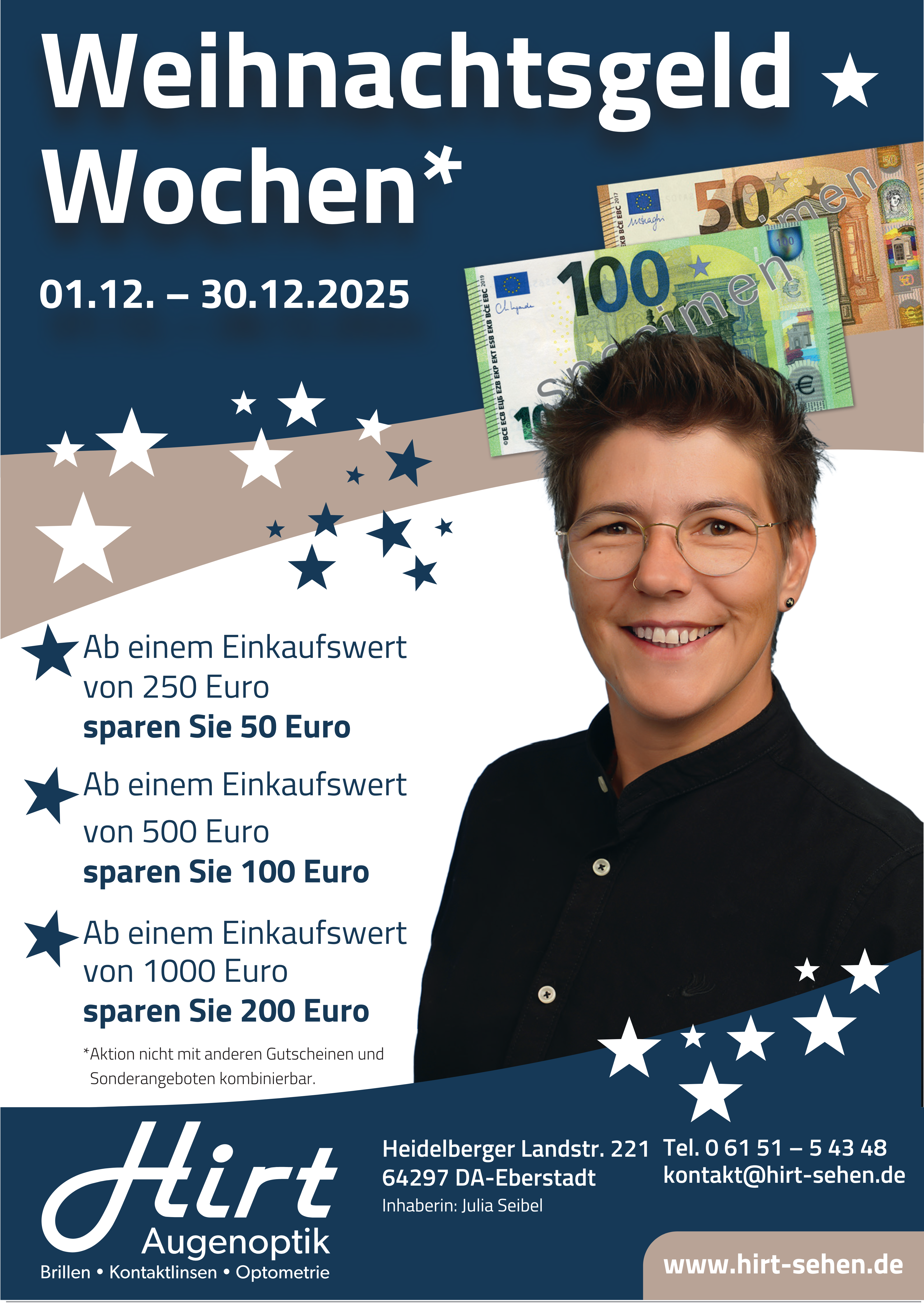 Die langjährige Mitarbeiterin und Augenoptikmeisterin Julia Seibel hat 2023 die Geschäftsführung und Inhaberschaft, sowie das gesamte Team von Augenoptik Hirt in Darmstadt-Eberstadt übernommen. Kompetenz dürfen Sie bei ihr und ihrem Team voraussetzen. Zum perfekten Augenoptik Hirt Kundenservice gehören allerdings noch zwei weitere, sehr wichtige Faktoren: